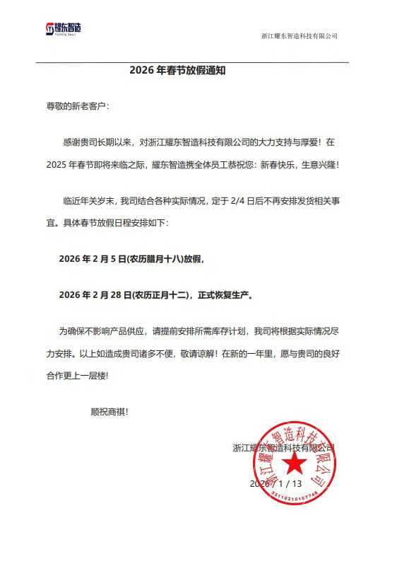 (절강성, [현재]) 설날이 다가오면서 다양한 업계가 연례 점검 및 휴식 기간을 시작했습니다. 오늘 Zhejiang Yaodong Smart Manufacturing Technology Co., Ltd.는 봄 축제 운영 일정을 공식적으로 발표하여 2025년 생산 및 배송 노력을 성공적으로 마무리하고 휴일 전 최종 스프린트의 시작을 기념했습니다.